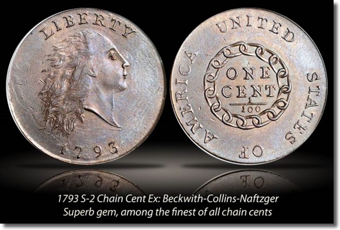 1793 Chain Cent (S-2) graded PCGS MS65BN that set a world’s record in 2005 as the most valuable U.S. cent at the time;