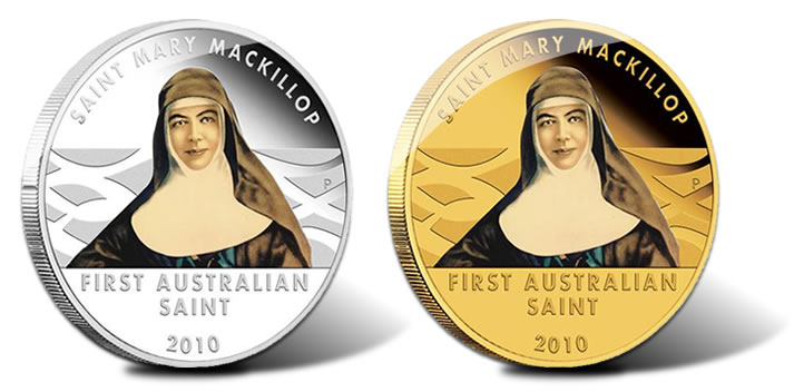 Struck from 1oz of 99.9% pure silver and 1/10oz of 99.99% pure gold, each coin is issued as official Australian legal tender. Each release features a colour portrait of Blessed Mary and the inscriptions SAINT MARY MACKILLOP, AUSTRALIA’S FIRST SAINT, the 2010 year-date and The Perth Mint’s ‘P’ mintmark.