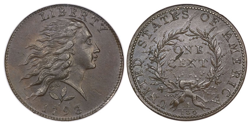 On the early coinage side, the most prestigious pedigree belongs to a 1793 Wreath cent with Vine and Bars edge, S-5, B-6, graded MS61 Brown by PCGS. It is estimated at $50,000+.