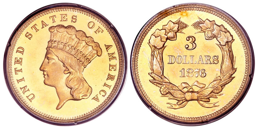 In addition to proof silver, proof gold is also well-represented in this auction by an 1876 three dollar gold piece graded PR63 by PCGS, a proof-only issue with an official mintage of just 45 pieces, among the most elusive Philadelphia dates in the series.
