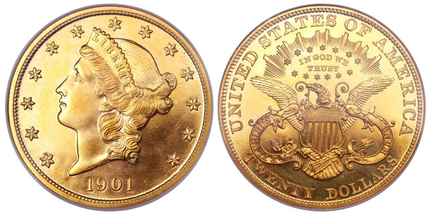 A 20th century highlight in the proof gold category comes with a 1901 double eagle graded PR66 Cameo by NGC. Proof twenty dollar gold pieces are among the most prestigious series for U.S. collectors.