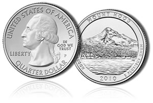 The Mount Hood National Forest Quarter launches into circulation on Monday, November 15. It is the last of the this year’s quarters. At noon ET, bags and rolls of the coins will be available for purchase at the Mint’s online store (http://usmint.gov/catalog/). Two-roll sets containing 40 quarters from Philadelphia and 40 coins from Denver have a price tag of $32.95. The bags of 100 coins available from either Mint facility will cost $35.95.