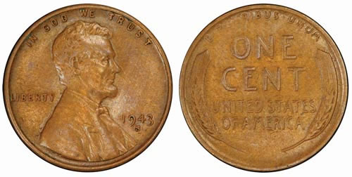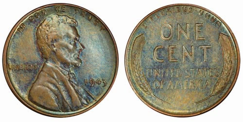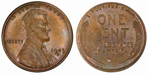 Zinc-coated steel was used for producing cents in 1943 to conserve copper for other uses during World War II, but a small number of coins were mistakenly struck on bronze planchets left over from 1942.