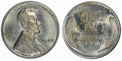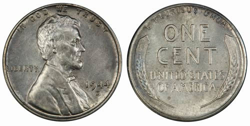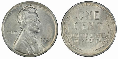 In 1944 the Mint resumed use of copper for cent production using recycled ammunition shell cases; however, a small number were mistakenly struck on zinc-coated steel planchets intended for use only on 1943-dated cents.