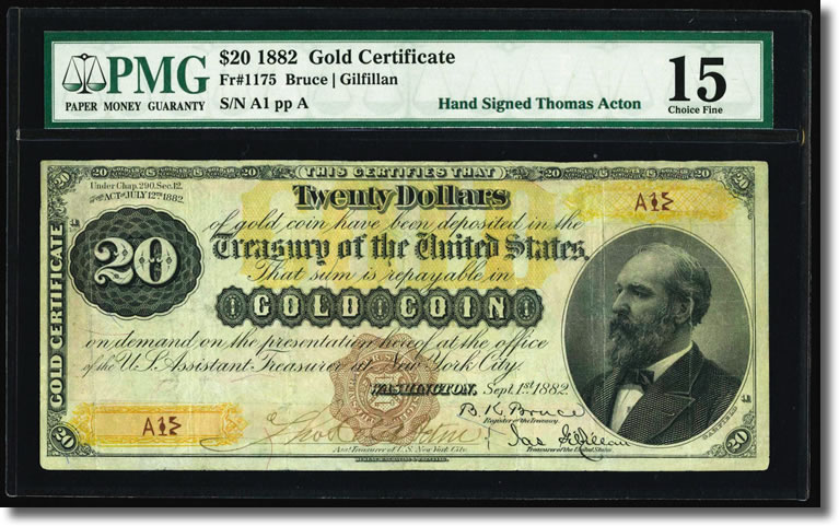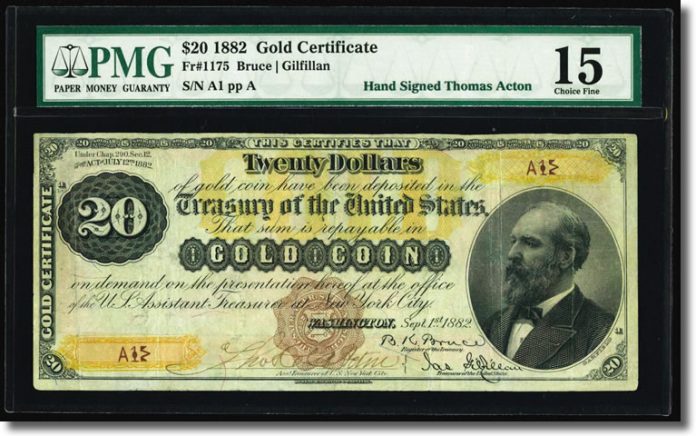 The auction will also include a Serial Number One Fr. 1175 $20 1882 Gold Certificate PMG Choice Fine 15 that carries an estimate of $400,000 to $500,000. This spectacular Gold Certificate is one of only two known, with the other example listed in the census, but yet to make an auction appearance.
