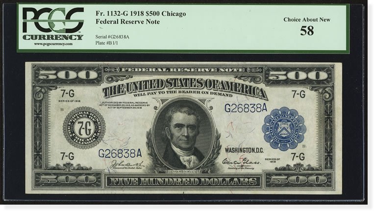 A spectacular Chicago district note with a pedigree to the Amon Carter, Jr. Collection, a Fr. 1132G $500 1918 Federal Reserve Note with a grade of PCGS Choice About New 58, will also be offered. The gorgeous $500 has an estimate of $40,000 and up.