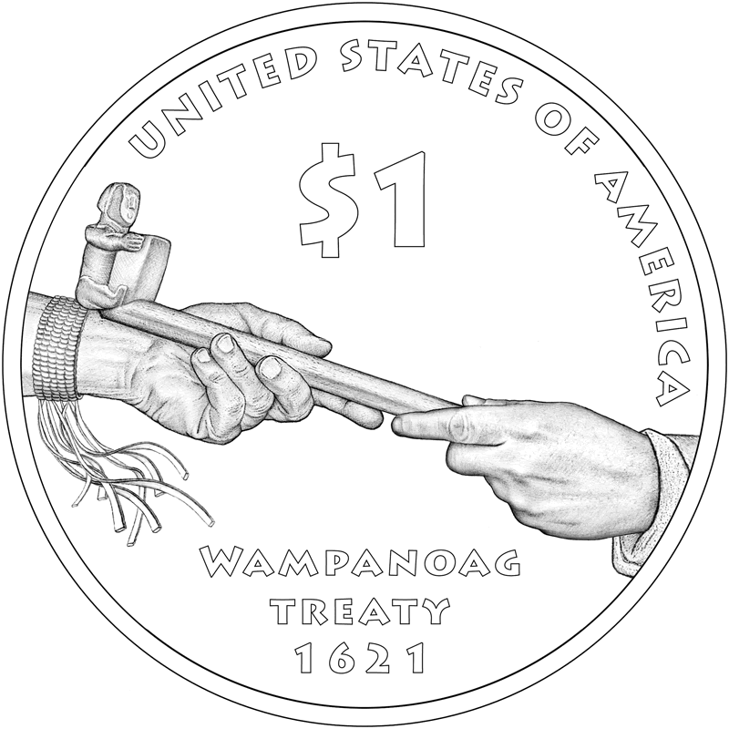 The 2011 Native American Dollar reverse design, by Richard Masters, depicts the hands of the Supreme Sachem Ousamequin Massasoit and Governor John Carver, symbolically offering the ceremonial peace pipe after the initiation of the first formal written peace alliance between the Wampanoag tribe and the European settlers. Inscriptions include UNITED STATES OF AMERICA, $1, and WAMPANOAG TREATY 1621.