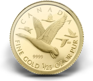 With a stature far outweighed by its popularity, the Mint’s 1/25 oz 99.99% pure gold coin returns in 2011 with a lively engraving of a flock of Canada Geese.