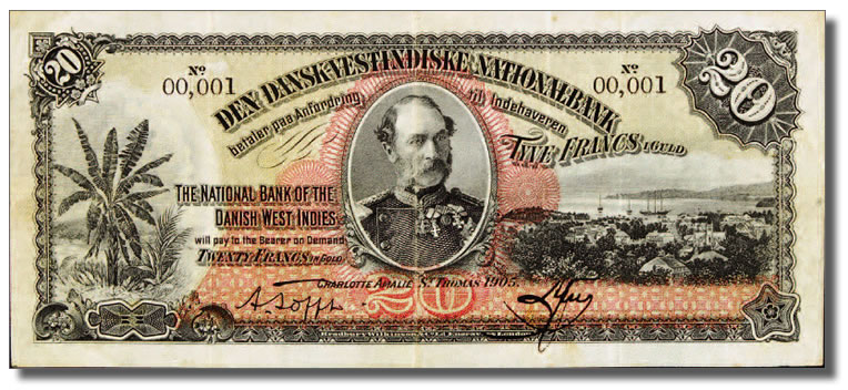 Also, an exceeding rare banknote with serial number one type, lot 201, a 1905 Twenty Francs in Gold note from the National Bank of the Danish West Indies in Very Fine condition, climbed to $51,750.