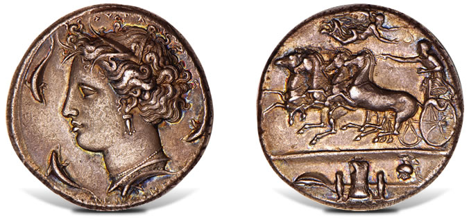 Standouts from the Jan. 10 sale include lot 36, a 405-367 B.C. Sicily AR Decadrachm from Syracuse, reverse die signed by the artist Euainetos in Good Very Fine condition from the Q. David Bowers Collection that sold for $109,250.