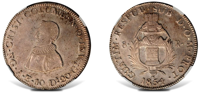 Lot 1036, a Guatemala 1854 A.E. 8 Reales certified AU-55 by NGC recognized as the only 8 Reales produced by the Republic of Guatemala, crossed the auction block for $70,800.