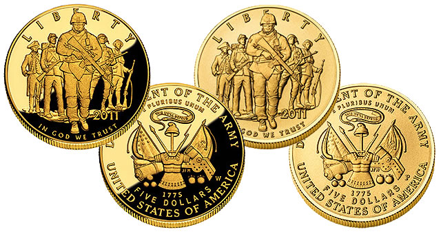 The United States Army Commemorative Coin Act, which was signed into Public Law 110-450 by President George W. Bush on December 1, 2008, authorized a Commemorative Clad Half-Dollar composed of the same metals used in circulation coins, a Commemorative Silver Dollar struck in 90% silver (0.774 troy ounces) and 10% copper, and a Commemorative $5 Gold Coin minted from 90% gold (0.242 troy ounces) and 10% alloy. Each of the three denominated versions have differing obverse and reverse designs and each celebrates the 1775 establishment of the U.S. Army, which was founded 236 years ago.