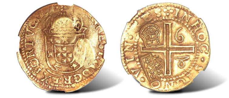 Two important South American coins competed for collector attention on their way to realizing the same price of $103,500. The first, an extremely rare early Brazilian gold coin, a Pedro Regent Prince 4400 Reis c/s over Portuguese 4 Cruzados AU50 NGC, is a truly amazing early "counterstamped" issue that is just one of a handful know, and the first of its kind to come up for auction in the United States.