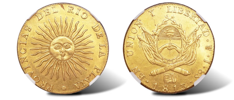 The second was a splendid gold "Sunface" Provincias de Rio de la Plata 8 Escudos 1813J, one of the greatest South American rarities, Argentina’s first independent gold issue and certainly one of the most beautiful coins ever minted.