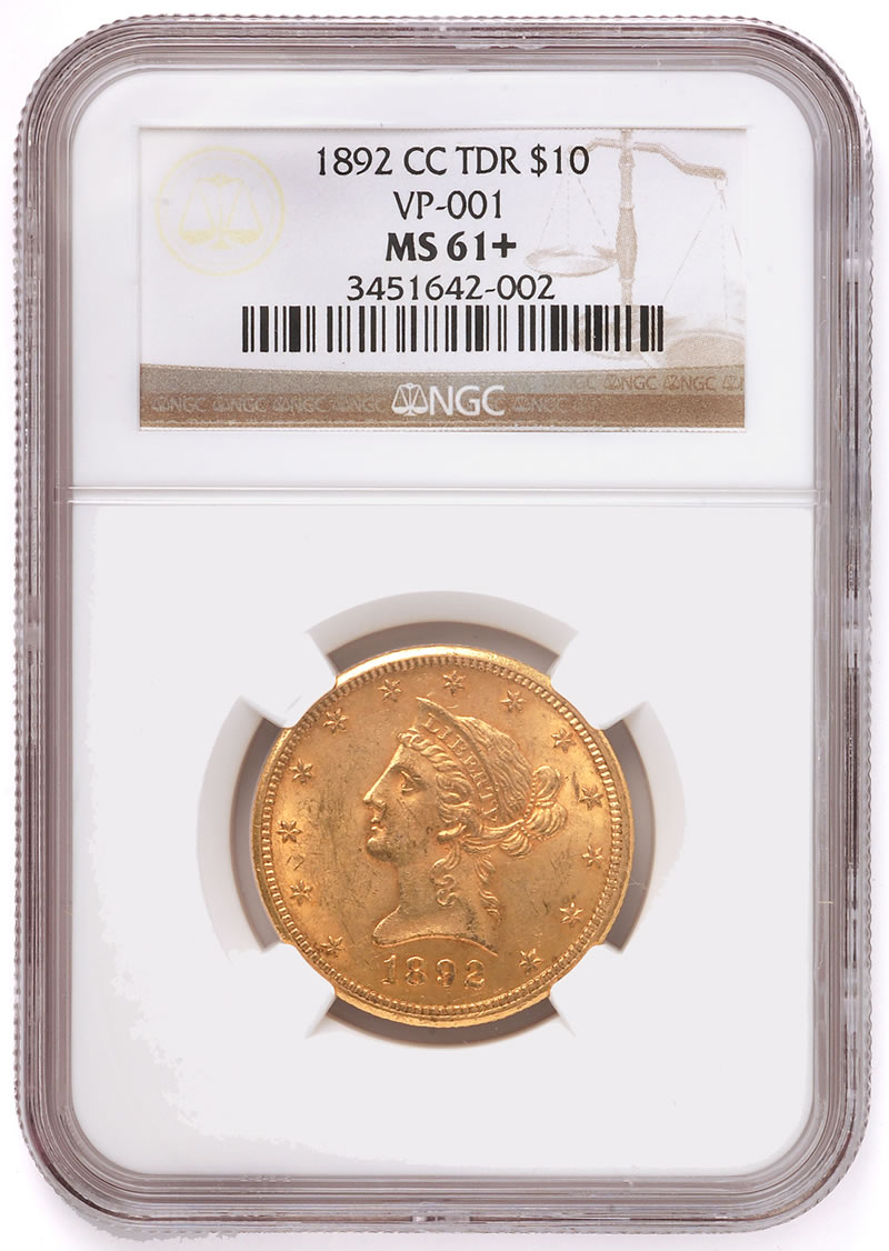 NGC has graded the coin MS-61+ and labeled it VP-001. The VarietyPlus® numbering system is used by NGC for varieties not already assigned variety numbers in popular reference books, and this is the first variety reported for 1892-CC eagles.