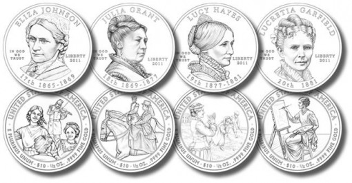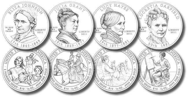 The United States Mint has unveiled the final design images for the 2011 First Spouse Gold Coins featuring the wives of Presidents Johnson, Grant, Hayes, and Garfield. These men will be depicted in 2011 on Presidential $1 clad coins released into circulation while their spouses will be honored on $10 gold collector pieces sold by the US Mint directly to the public.