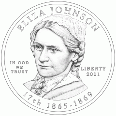Joel Iskowitz designed the portrait seen of the obverse of both Eliza Johnson First Spouse Gold Coins. Inscriptions include ELIZA JOHNSON, 17th, 1865-1869 and 2011. Don Everhart sculpted the design.