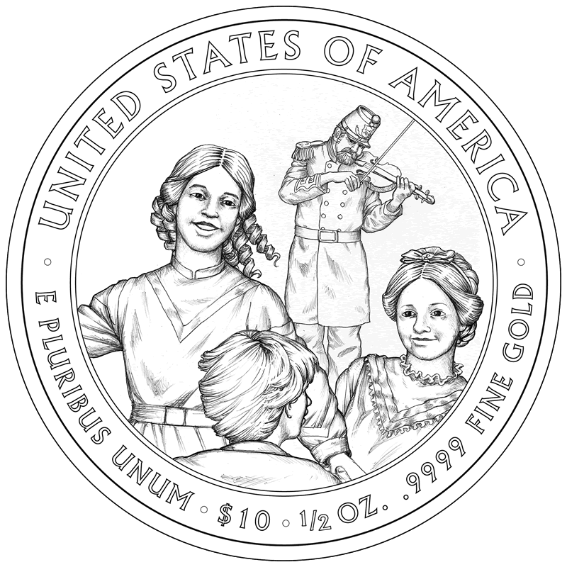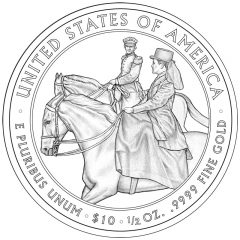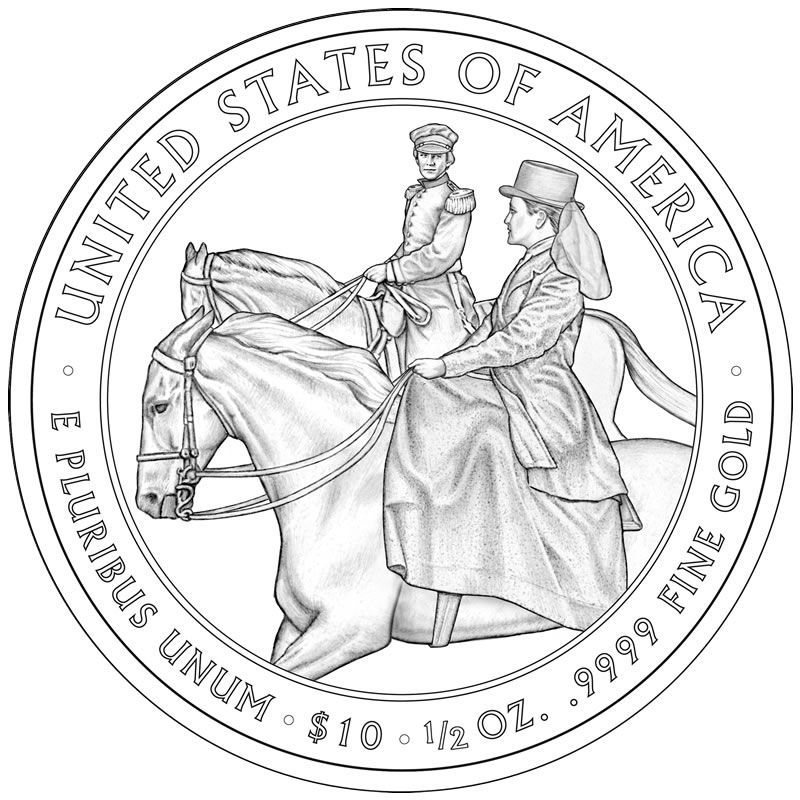 The reverse design image depicts a young Julia Dent and Ulysses S. Grant, then a West Point cadet, horseback riding at her family’s plantation, White Haven. Richard Masters designed the reverse image. Charles L. Vickers is credited for the sculpting.