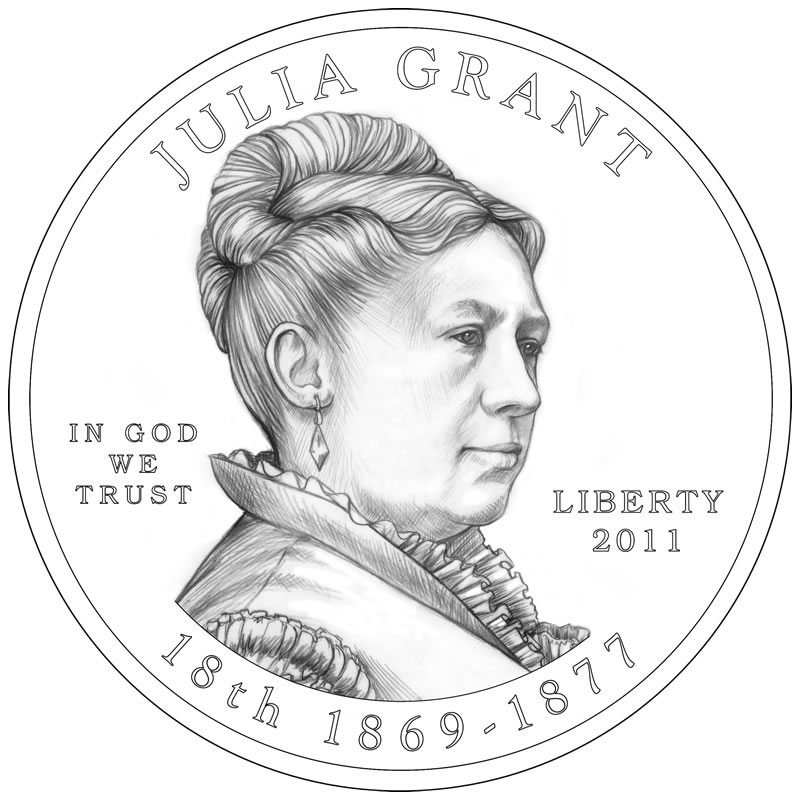 Donna Weaver designed the obverse image that is seen on Julia Grant First Spouse Gold Coins. Inscriptions include JULIA GRANT, 18th, 1869-1877 and 2011. It was sculpted by Michael Gaudioso.