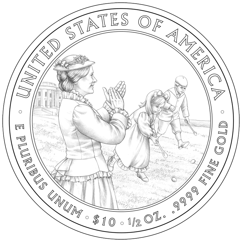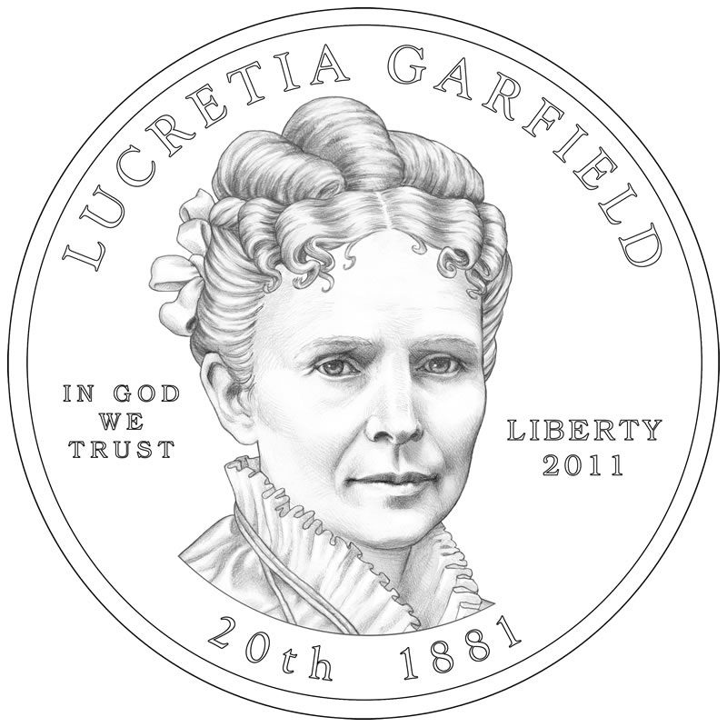 Barbara Fox also designed the obverse of each Lucretia Garfield First Spouse Gold Coin. Inscriptions are LUCRETIA GARFIELD, 20th, 1881 and 2011. Phebe Hemphill was the sculptor.