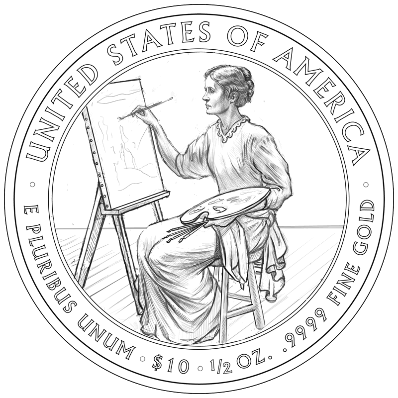 The reverse design depicts Lucretia Garfield’s interest in art and features her painting on a canvas with brush and palette in hand. It was designed and sculpted by Michael Gaudioso.