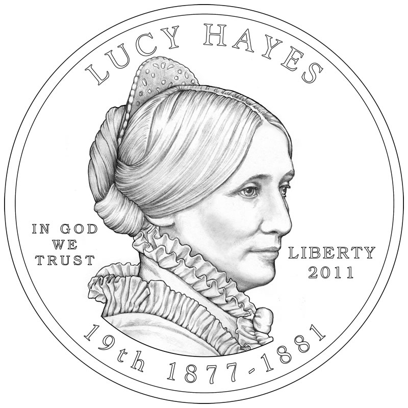 The obverse of the Lucy Hayes First Spouse Gold Coins was designed by Susan Gamble and includes the inscriptions LUCY HAYES, 19th, 1877-1881 and 2011. It was sculpted by Don Everhart.