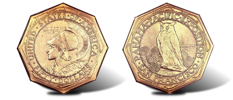 Always a highly anticipated event when they turn up at auction, a 1915-S $50 Panama-Pacific Octagonal MS63 PCGS, the last and greatest coin in an original four-piece commemorative set, lived up to the billing by bringing $86,250, amid spirited bidding, to round out the top trio of the Heritage Long Beach event.