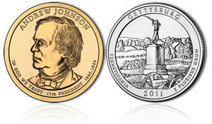 US Mint circulating coin production levels in February 2011 retreated significantly from those of the previous month, but they were substantially higher than totals from February 2010. The latest US Mint figures also reveal the scarcest mintages for an Andrew Johnson Presidential Dollar and the Gettysburg National Military Park Quarters.