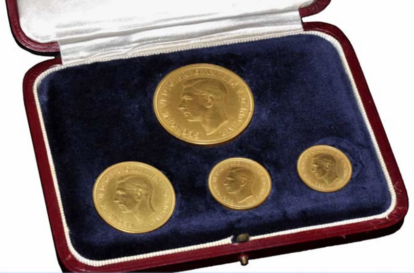 Offered in its original Royal Mint case, a set of four 1937 Gold, Matt Proof finish coins, commissioned to commemorate the Coronation of King George VI, are sure to be the highlight of the Baldwin’s London auction, due to be held in May 2011.