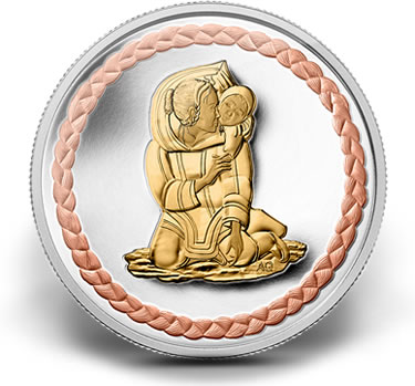 The pink gold-plated braid surrounding this image plated in yellow gold illustrates the typical braiding of an Inuit woman’s hair and hints at the unbreakable bond between mother and child.