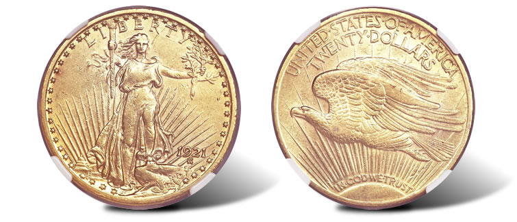 A 20th century gold rarity is a 1921 double eagle graded AU53 by NGC. The vast majority of the 1921 double eagles minted were never released and later destroyed by the government, but a tiny percentage of the coins were distributed.