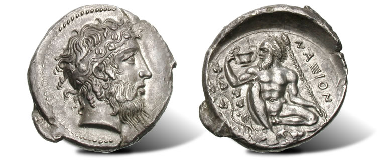A spectacular silver tetradrachm of Naxos in Sicily, struck circa 415 BC, brought $174,800 and a gold medallion of the Roman Emperor Constantius II fetched $126,500 at the Heritage-Gemini auction of ancient coins, Thursday, April 14, in conjunction with the Chicago International Coin Fair in Rosemont, IL. All prices quoted include the 15% buyer’s premium.