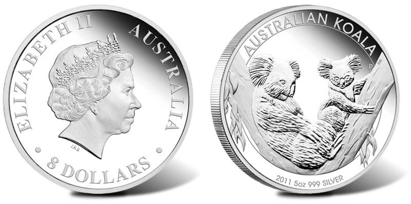 The new 5 ouncer makes the fifth different size for the 2011 Australian Koala Silver Coin series. The first four offerings were bullion quality and were released on October 4. From smallest to largest, the other koala coins come in half-ounce, one-ounce, ten-ounce and one kilo sizes.