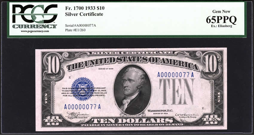 "While consisting of just nine notes, this is a difficult set to complete in high grade as the 1933 $10 is always a ‘stopper.’ This set includes a Gem New 65PPQ example of that scarce series, which is currently a ‘pop 2’ with only one note finer. Of the other eight notes in this set, three others are "top pop" for their respective types. The remaining five notes are superlative representatives of their types with only one or two known finer examples. The weighted GPA of 69.1 is theoretically improvable, but what a start for a new set!"