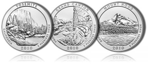 The Grand Canyon coin honors the national park located in the state of Arizona. The coin’s design, by Phebe Hemphill, depicts the granaries above the Nankoweap Delta in Marble Canyon which is near the Colorado River. Inscriptions include GRAND CANYON, ARIZONA, 2010 and E PLURIBUS UNUM.