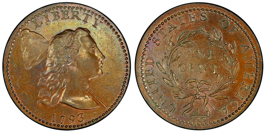- 1793 Liberty Cap cent, beaded border, graded PCGS Secure Plus MS64BN (Population 1, none higher).