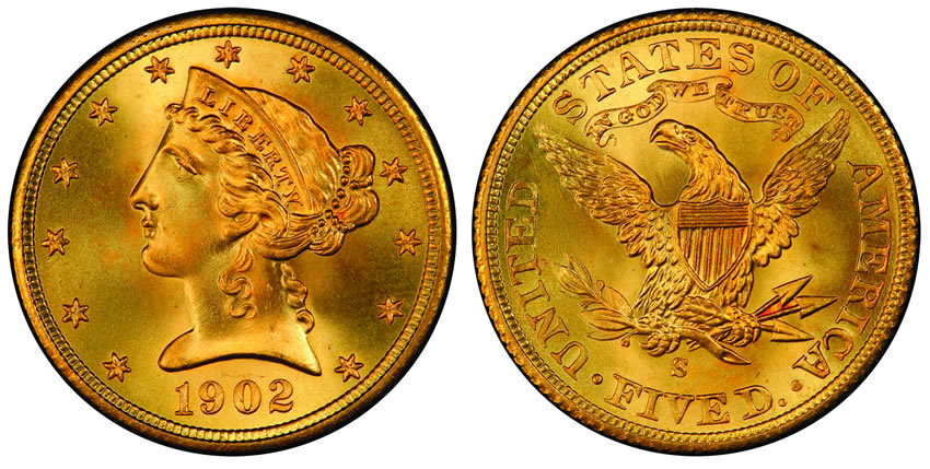 - 1902-S Liberty $5 with motto, PCGS Secure Plus MS69 (population one, none higher).