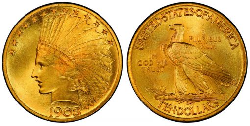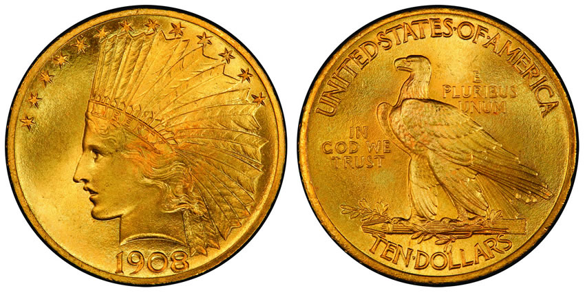- 1908 Indian $10 with motto, PCGS Secure Plus MS68+ (population one, none higher).