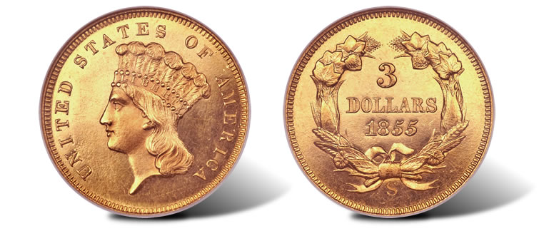 Elite proof coinage is also a strong presence in the auction. No coin exemplifies this quite like the unique 1855-S branch mint proof three dollar gold piece, PR64 Cameo NGC, CAC.