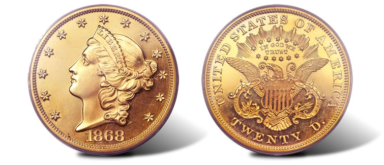 Last but not least among the proof gold highlights is an 1868 double eagle, PR64+ Deep Cameo PCGS Secure, CAC. Only 25 proofs were struck, and of those coins, only six or so remain in private hands. This elite specimen once resided in the cabinet of the legendary gold coin enthusiast Harry Bass.