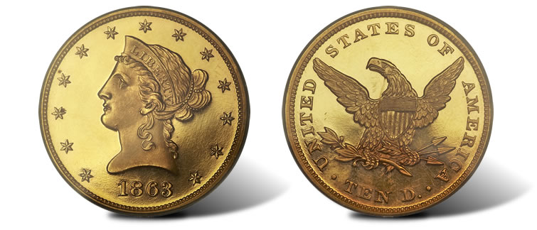 The third front-cover coin of Platinum Night is an 1863 ten dollar gold piece, PR65 Deep Cameo PCGS, CAC.
