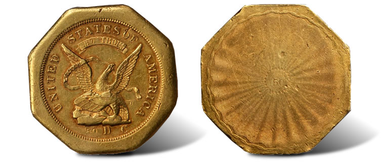 - Lot 7547, 1851 Augustus Humbert $50 Gold, Lettered Edge, 50D C, 887 THOUS, With 50 on Reverse, AU-55+ (PCGS), CAC, From the Rajj Collection, realized $287,500