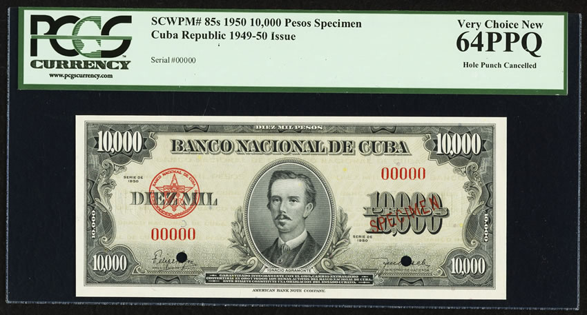 The auction included a large selection of rare Cuban material with the top seller being a Cuba Republic 10,000 Pesos 1950 Pick 85s Specimen graded PCGS Very Choice New 64PPQ, which brought $5,750.