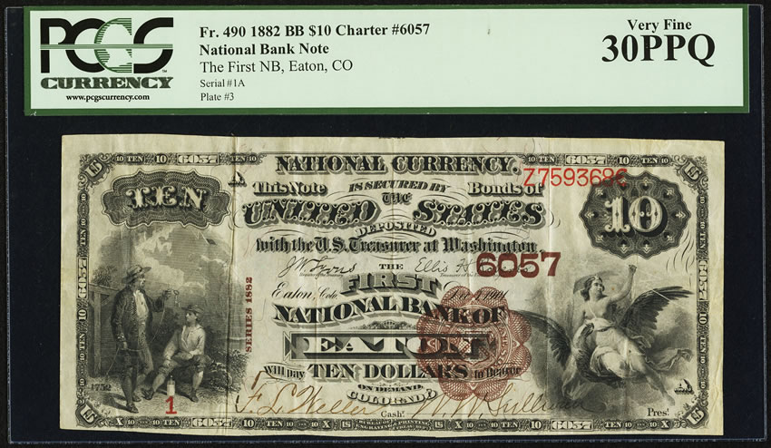 Other Nationals of note were the PCGS Apparent Very Fine 20 San Francisco, CA – $20 Original National Gold Bank Note Fr. 1152 The First National Gold Bank Ch. # 1741 that hammered for $43,125, the Tombstone, AZ – $10 1902 Plain Back Fr. 628 The First NB Ch. # (P)6439, graded PCGS Very Fine 30PPQ, that sold for $41,688 and the Eaton, CO – $10 1882 Brown Back Fr. 490 The First NB Ch. # 6057, graded PCGS Very Fine 30PPQ, that catapulted well beyond the pre-auction estimate of $12,500+ to cross the auction block for $37,375.