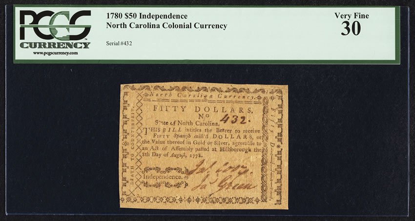 The Kings Mountain Collection, containing primarily Colonial notes from the Southern States, including many rare pieces, saw strong prices for a number of offerings. Foremost among them was the exceedingly scarce North Carolina 1780 $50 Independence PCGS Very Fine 30 example that realized $10,350.