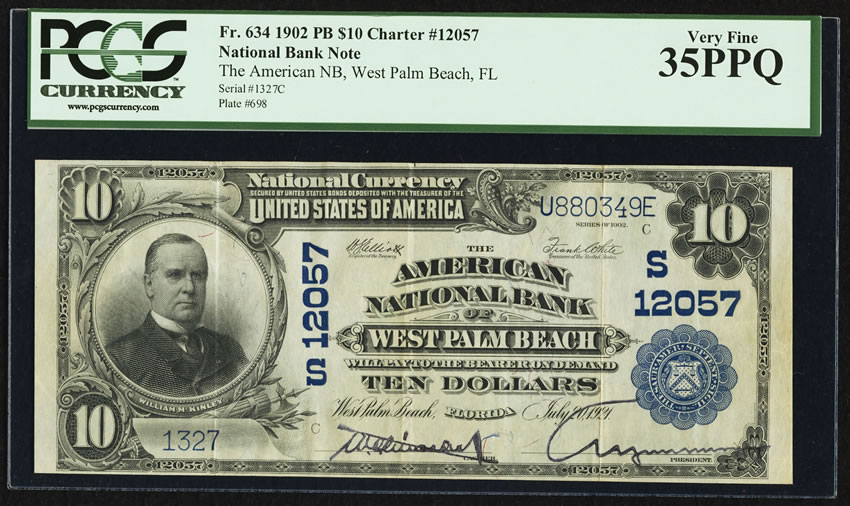 National Bank Notes were offered during Session Two. Two notes from Palm Beach County, Florida, brought strong prices in particular with the Lake Worth, FL – $5 1902 Plain Back Fr. 607 The First NB Ch. # 11716, graded PCGS Very Fine 30, selling for $44,563, while the West Palm Beach, FL – $10 1902 Plain Back Fr. 634 The American NB Ch. # (S)12057 example, with a PCGS grade of Very Fine 35PPQ, realized $37,375.