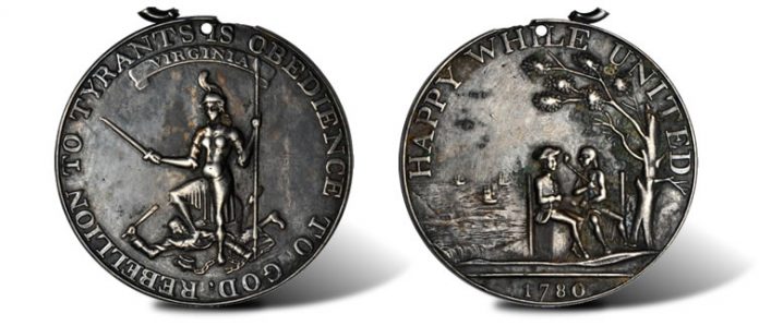 Lot 83, 1780 Virginia Happy While United Medal. Betts-570. Silver. Plain Edge. Choice VF. The only known silver example. $109,250