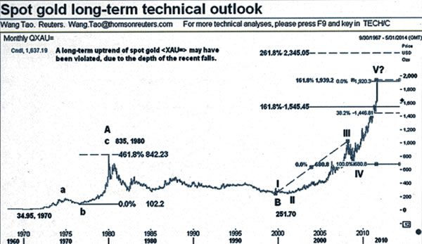 Spot gold lost $14.00 on the open and was quoted at near $1,610.00 per ounce on the bid-side. It might perhaps be too early to call this kind of action in gold ‘consolidation’ rather than a resumption of the downtrend; not when bearish formations are popping up on charts again. Long-term charts reveal that, according to Thomson Reuters technical analyst Wang Tao, gold’s 12-year bull-run may have drawn to a close with the recent declines in price. Graphically speaking, the statement looks like this: