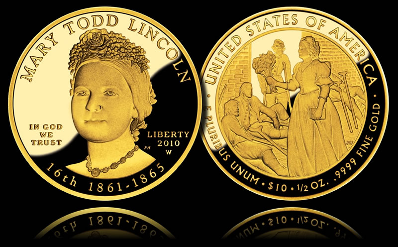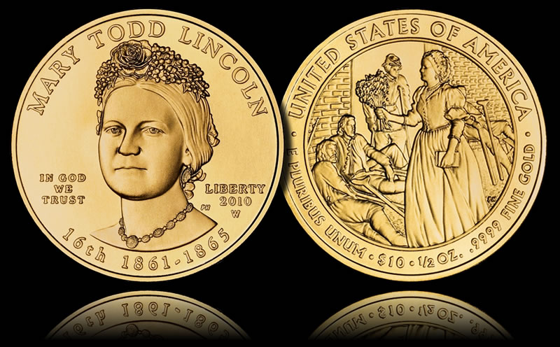The First Spouse Gold Coin series began in 2007, and each coin carries a $10 face value. The Mary Todd Lincoln designs were the seventeenth in the program and the fourth to launch in 2010. When they were released, the proof cost $854 and the uncirculated was $841. On the last day of its availability, the proof was priced at $1,054 after having been raised several times over the past 11 months due to higher gold prices.