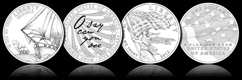 Artwork designs for next year’s 2012 Star-Spangled Banner Commemorative Coins were published by the United States Mint this week. These collectibles — in gold and silver — will celebrate more than just the 200th anniversary of the War of 1812, the selected designs commemorate the events that led to the writing of "The Star-Spangled Banner," the national anthem, by Francis Scott Key. (Read about the history.)